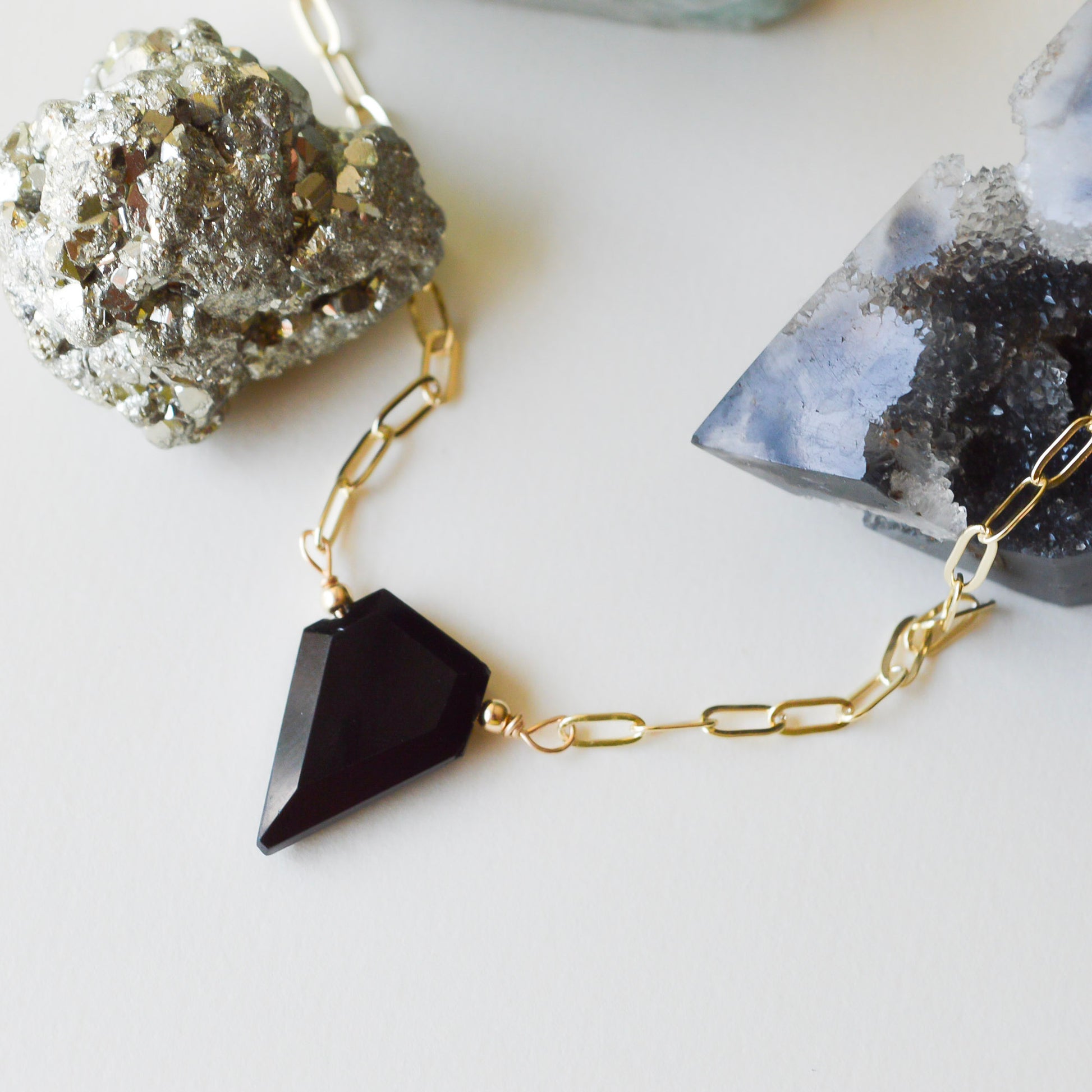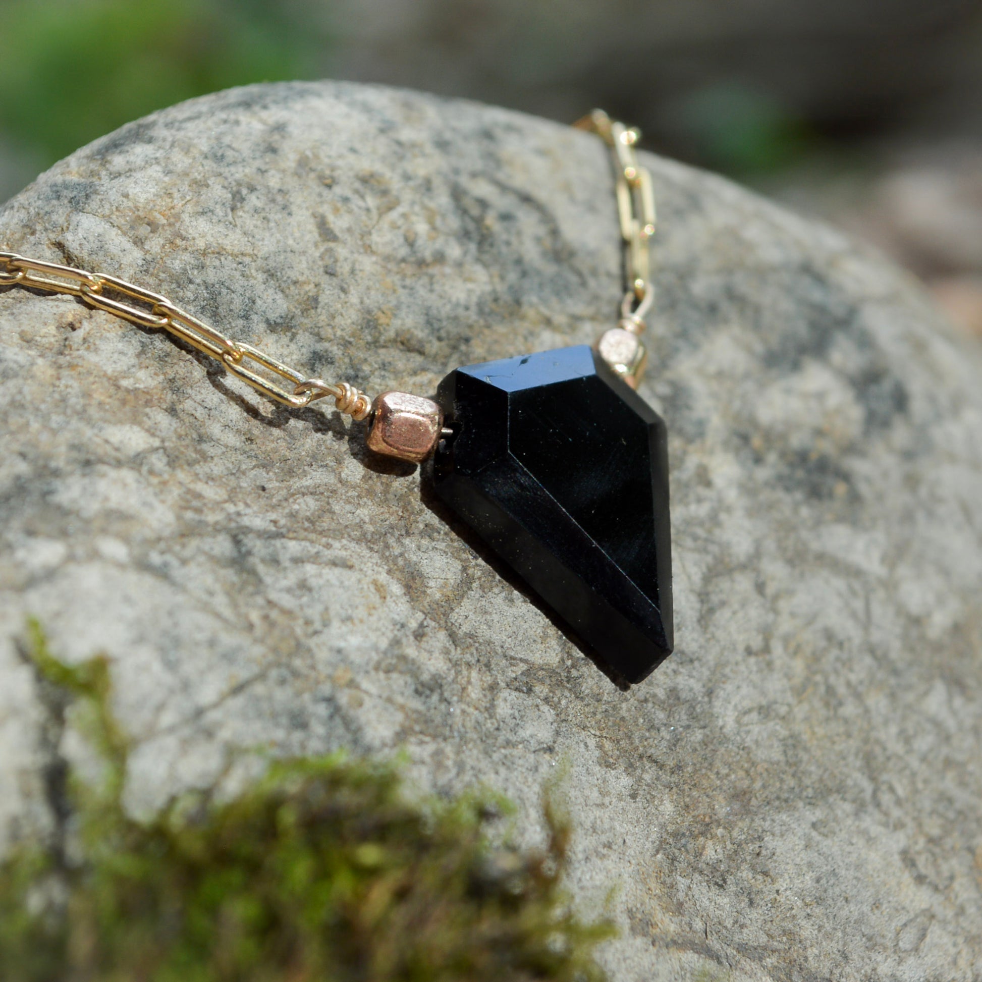 Black tourmaline is a grounding and protective crystal, naturally forming in long, striated crystals that can range from deep black to charcoal with subtle hints of metallic shimmer. In its raw form, it often appears in rugged, organic shapes, making each stone uniquely beautiful. The polished shield-cut you see in this necklace enhances its natural energy while highlighting the stone's inherent strength and character.